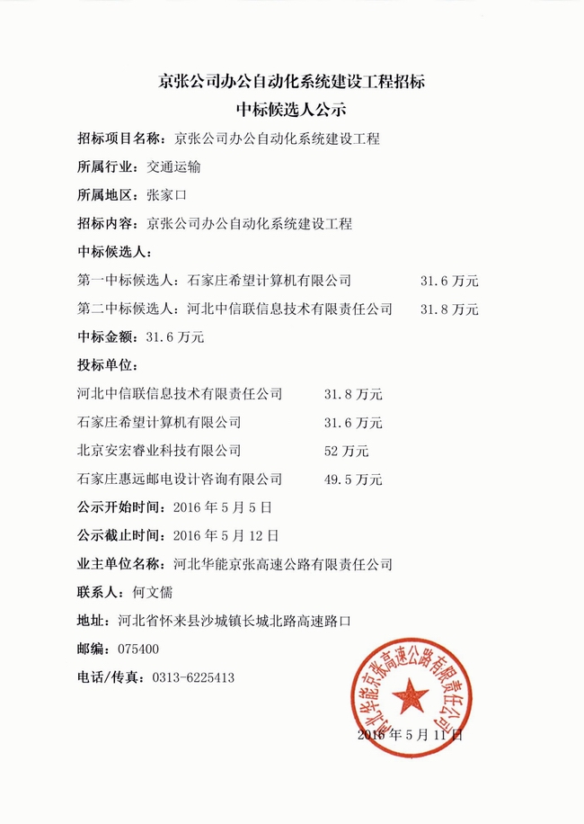 京張公司辦公自動(dòng)化系統(tǒng)建設(shè)工程招標(biāo)中標(biāo)候選人公示