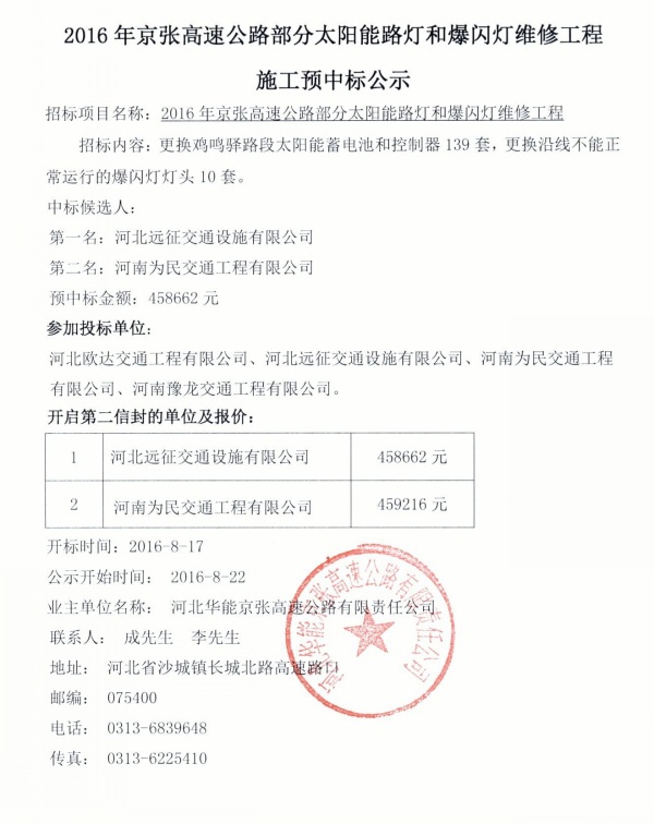 2016年京張高速部分太陽能路燈和爆閃燈維修工程施工預中標公示