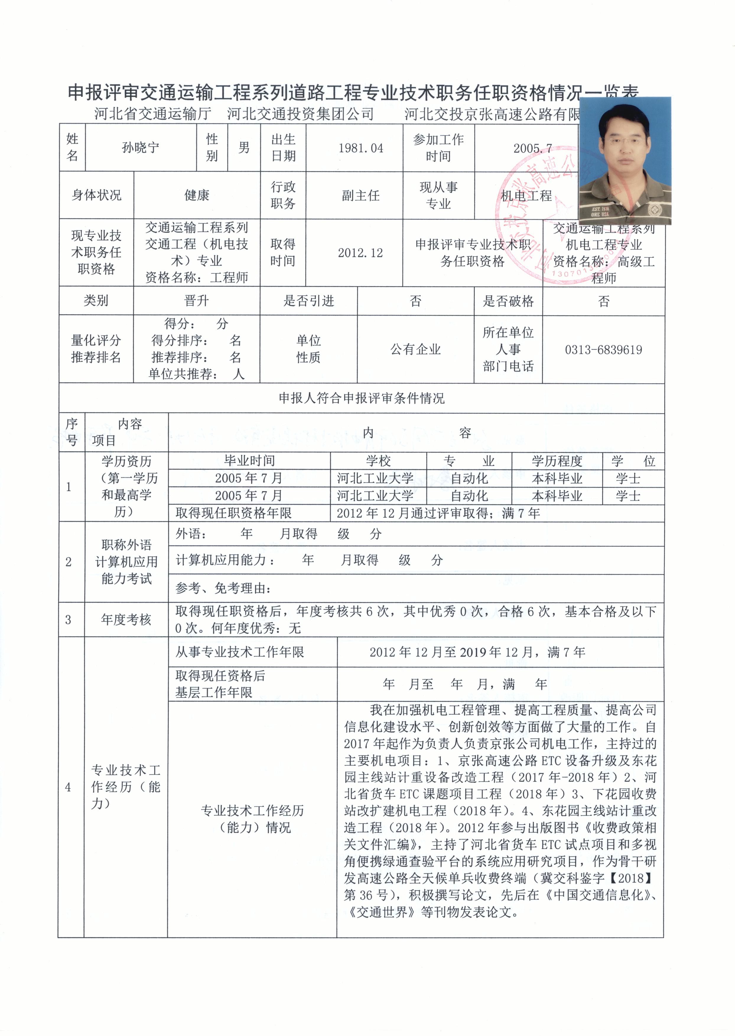 河北交投京張高速公路有限公司2019年度職稱申報人員基本情況公示
